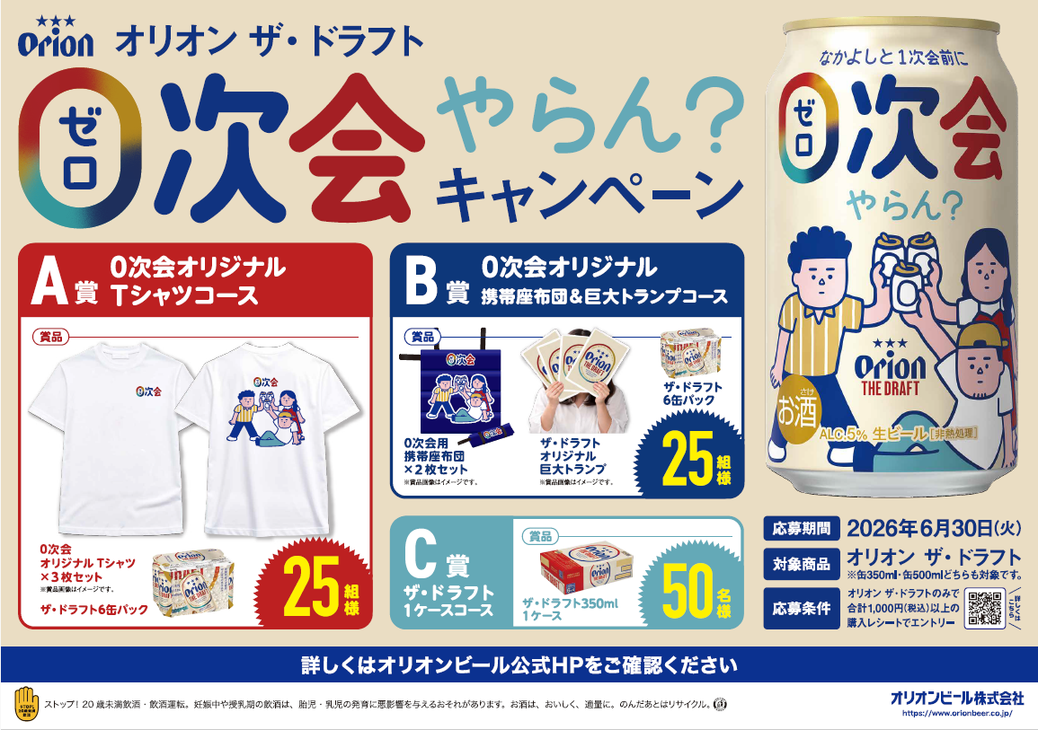 「0次会」とは、公式な飲み会(1次会)の前に、気心知れた仲間と気軽に一杯を楽しむひとときのこと。昨年第1弾として展開した“0次会”のCMやイベントは多くの方に楽しまれ、大きな盛り上がりとともに大変ご好評をいただきました。その楽しさをさらに広げる第2弾として実施する「オリオン ザ・ドラフト 0次会やらん?キャンペーン」では、0次会の楽しさをより多くの方に体験いただくため、「オリオン ザ・ドラフト」を1,000円(税込)以上ご購入いただいたレシートで、仲間との時間を盛り上げる0次会オリジナルTシャツや携帯座布団、巨大トランプなどのオリジナルグッズのほか、「オリオン ザ・ドラフト」缶350ml 6缶パックなどが抽選で合計100名様に当たるキャンペーンをご用意しました。