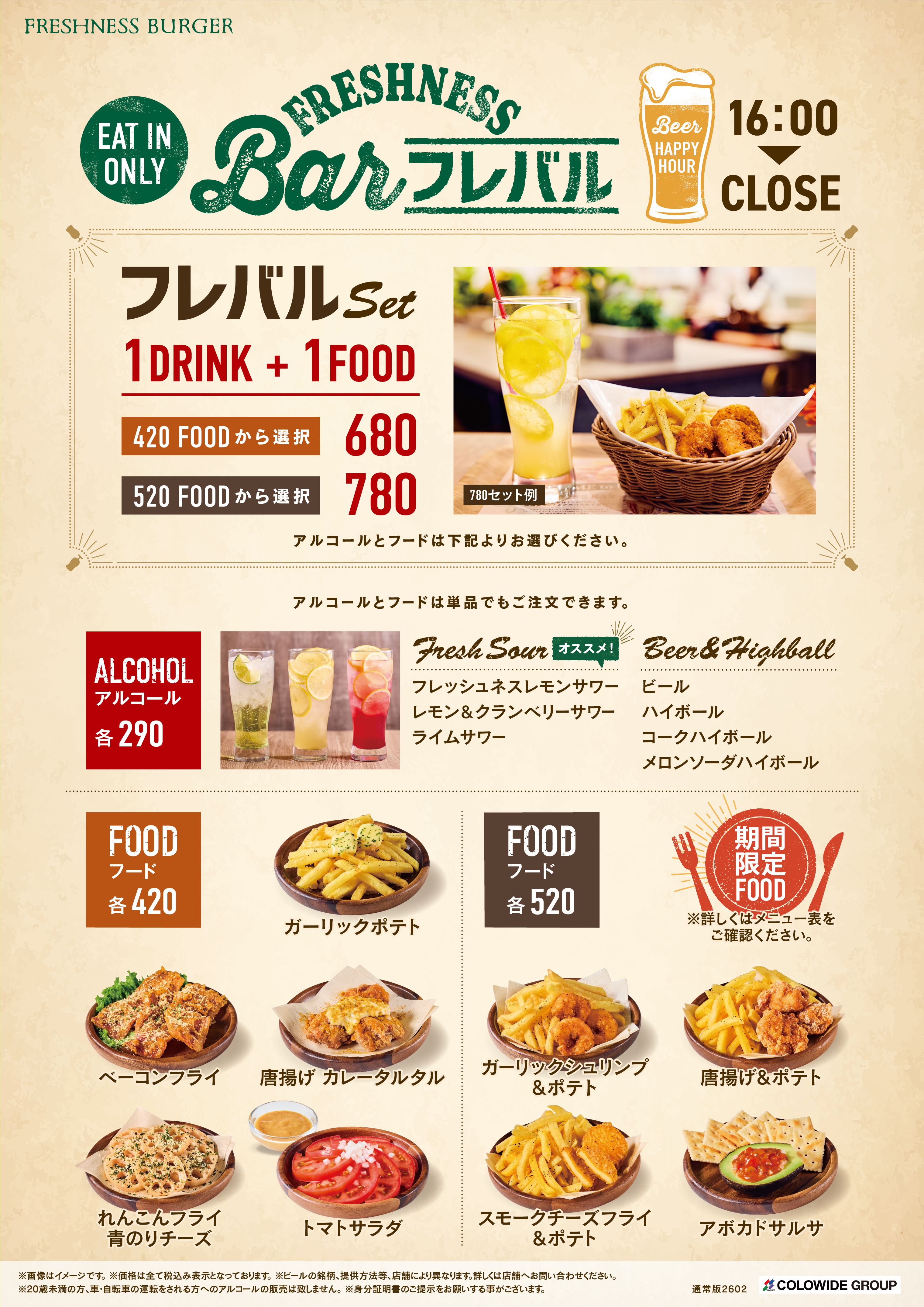 「フレバル」は、夕方16時以降に気軽に楽しめるアルコール&フードを提供する夜のひとときを楽しむサービスです。忙しい毎日の中で、『仕事帰りに軽く一杯』『食事前に少しだけつまみたい』『カフェより自由に、居酒屋ほど構えず過ごしたい』というご要望に応える、フレッシュネスバーガーが提案する夜のスタイル。お好きなドリンクとフードが選べるフレバルセット(680円/780円)をはじめ、ビール・ハイボール・フレッシュサワーなどのアルコール(290円)と、ガーリックポテト・アボカドサルサなど、お酒に合うフード(420円/520円)をご用意し、気軽に立ち寄れる“夜のサードプレイス”としてご好評いただいています。