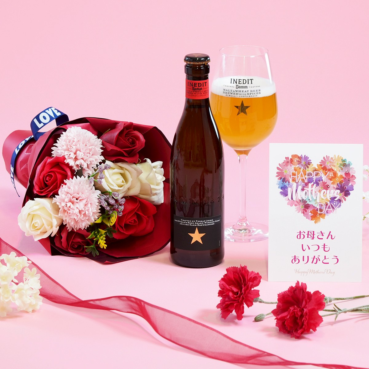 水やり不要でお手入れ楽々なソープフラワーと、フルーティーで華やかなセレブビール「イネディット」のセットです。