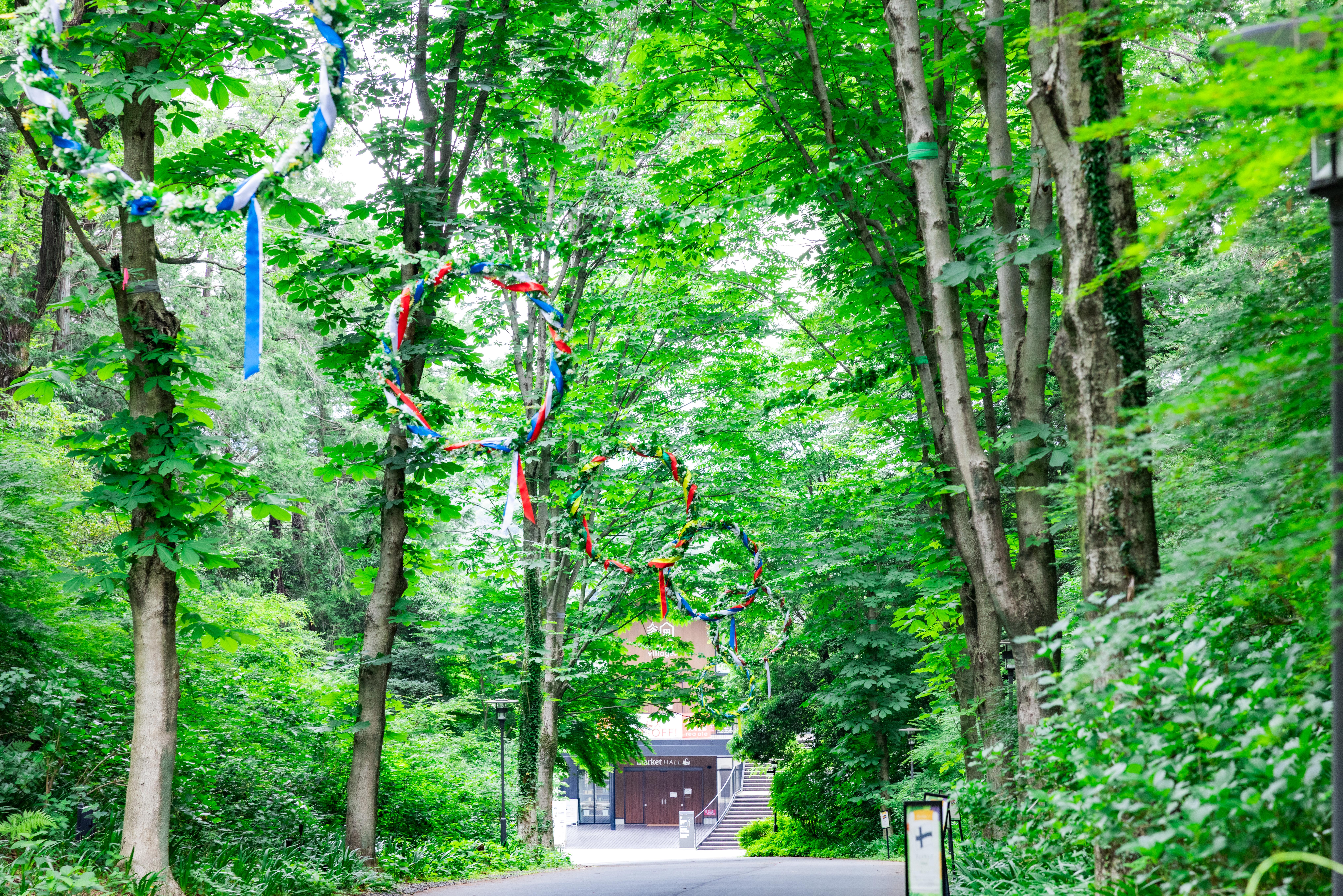 メッツァ入口のエントランスロード「メッツァティエ」では、夏至祭のマストアイテム「花冠」をモチーフにおめかしした「北欧8ヶ国の夏至の花冠ロード」が登場。北欧各国の国旗カラーのリボンを上品にあしらった巨大花冠はインパクト抜群!