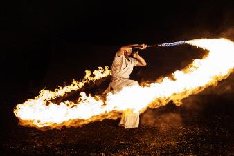 ファイヤーパフォーマンス歴22年。欧米で主流になりつつあるFlow Artという技術を取り入れながら技巧的な火食い芸や迫力ある火力の演出、異世界を彷彿とさせるような表現を得意とし、神社仏閣、地域の祭り、国内外の野外フェス等でファイヤーショーを展開。