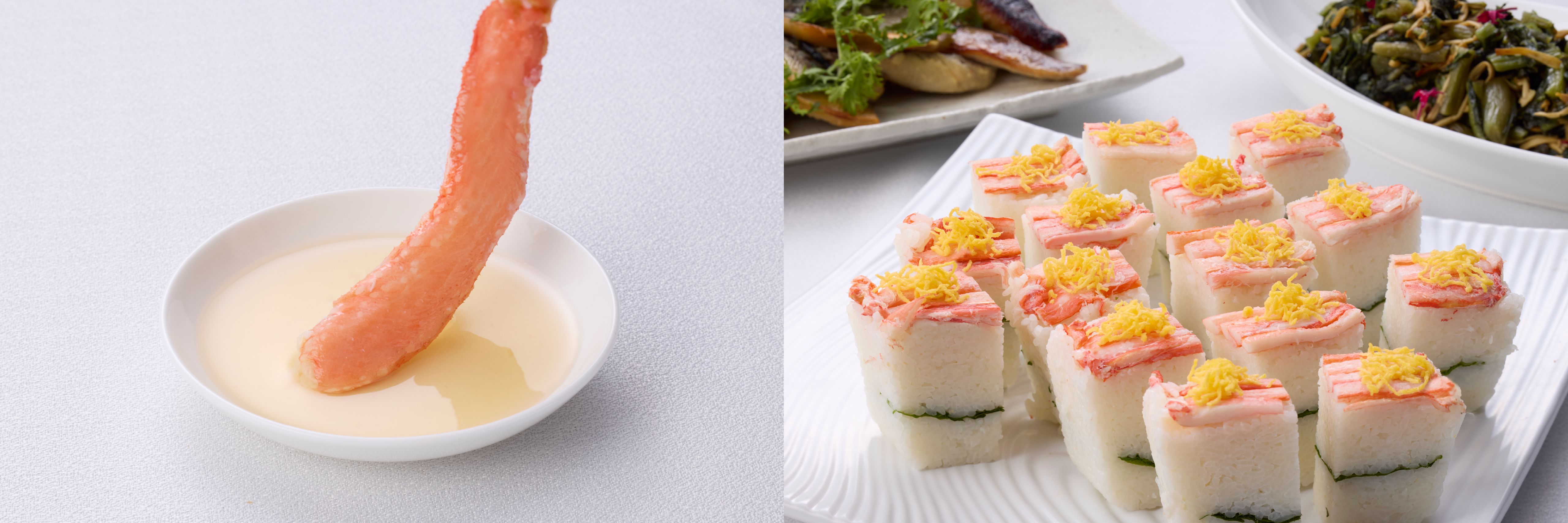 定番の「ボイルずわいがに」のほか、旨味が染み渡る「カニ炊き込みご飯」や、彩り鮮やかな「カニの押し寿司」、そして出汁の効いた「カニ汁」といったこだわりのカニメニューをご用意いたしました。さらに、地元長崎の豊かな旬を味わっていただくため、県産野菜を使用した「夏野菜の天麩羅」も登場します。冷菜・温菜からデザートまで、長崎ならではの味覚とカニを贅沢に組み合わせた約30種類の多彩なラインナップを、ぜひ心ゆくまでお楽しみください。