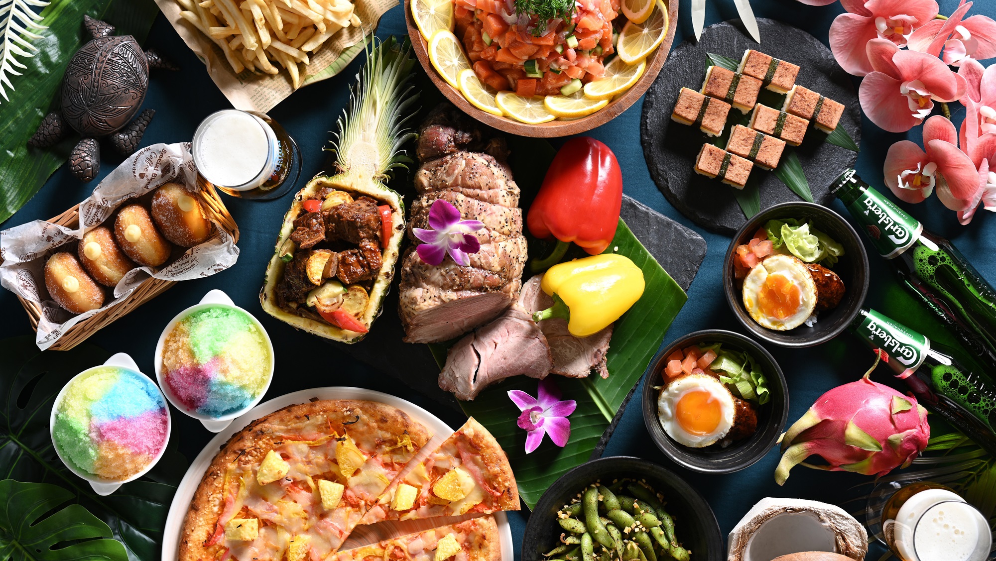 ロコモコ丼 / 瀬戸内六穀豚のロースト スパイス香るポリネシアンソース / ハワイアントロピカルピザ / スペアリブと豚バラ肉の煮込み トロピカル風 / ロミロミサーモン / モチコチキン唐揚げ / クラムチャウダー byプリンスワイキキ /マラサダ / レインボーシェイブアイス など