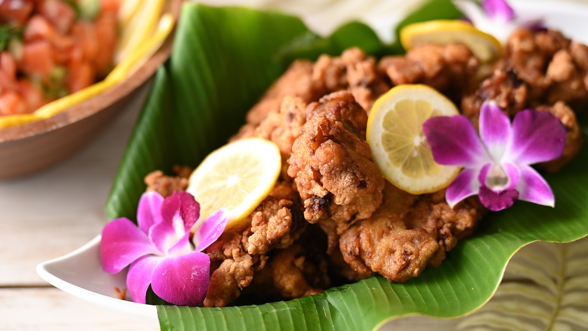 会場の大きな窓からは、潮風にそよぐヤシの木や、夕日に照らされた瀬戸内海もご覧いただけます。ご家族やご友人とともに、ハワイへ旅するような「Lea Lea(幸せ)」なひとときをお過ごしください。