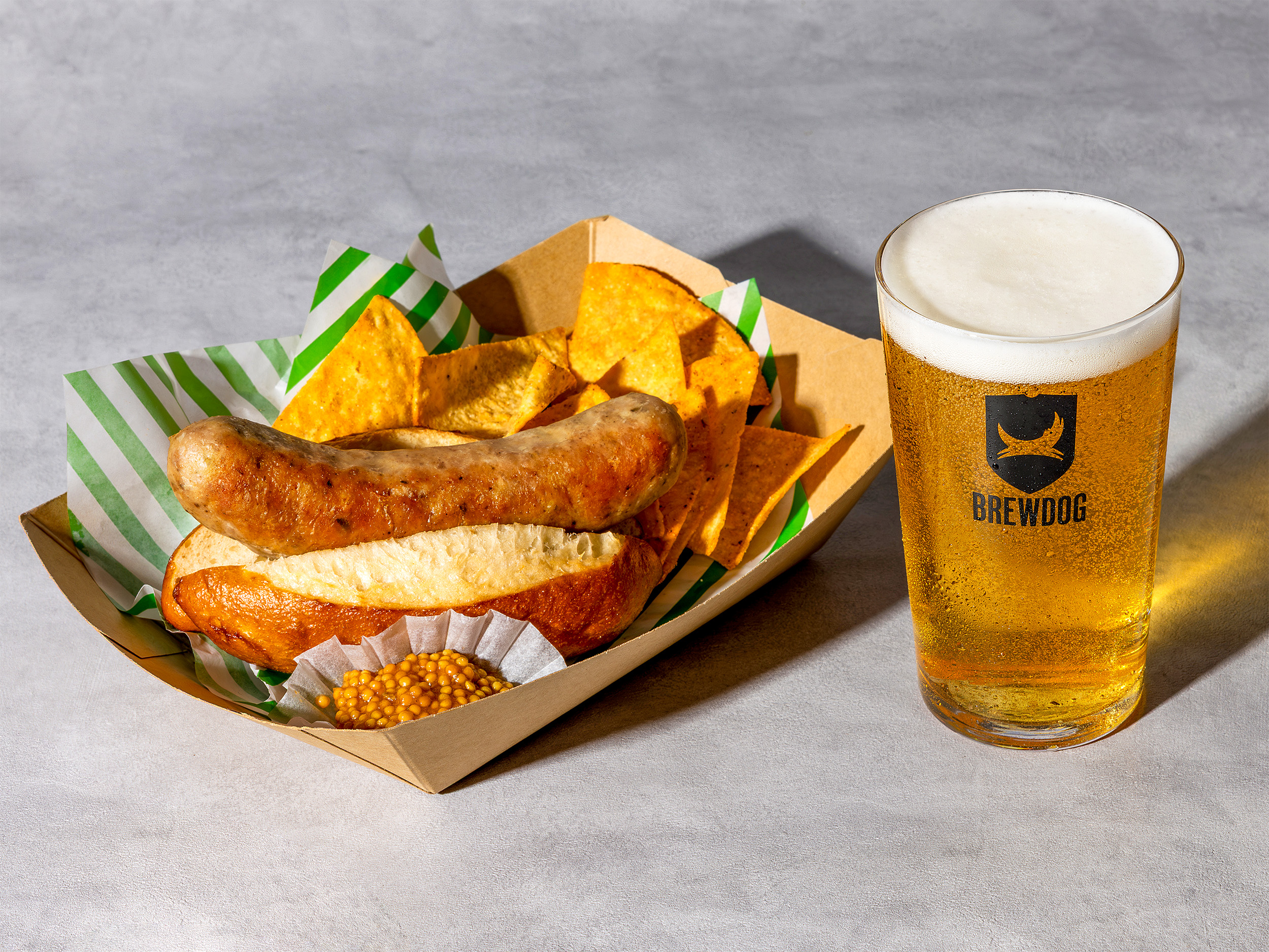 豪快な肉汁あふれる“粗びき生ソーセージ”は、信州のシャルキュトリー工房「デリカテッセン ヤマブキ」に特別オーダーいたしました。合わせるのは、外はパリッと香ばしく中はもっちりとした食感の、ベーカー特製“プレッツェルバンズ”。トマトの酸味とホップが香る自家製粒マスタードを添えて。お好みで国産のクラフトホットソース“Mellow Habanero”をかけてお愉しみください。