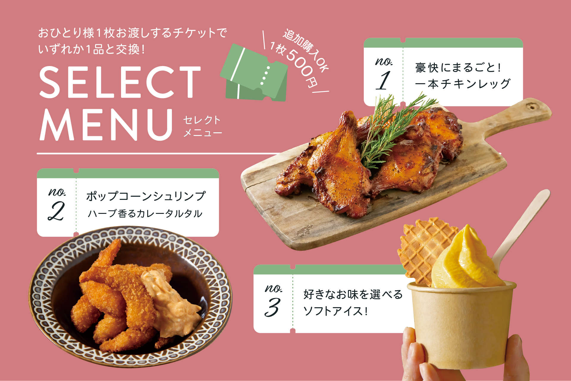 セレクトメニュー3種から1品選んで交換できるチケットが1枚ついた大人気のプラン
