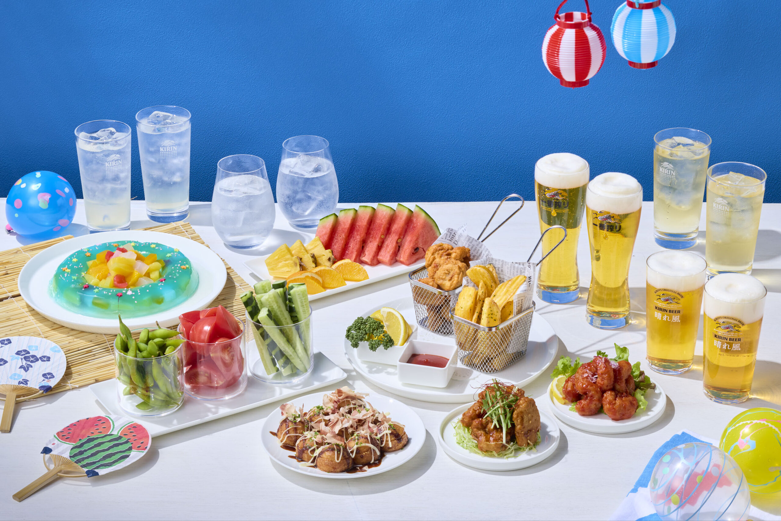 ドリンクには、麦本来のうまみが感じられる「キリン一番搾り」と、軽やかな飲み口が特長の「キリンビール 晴れ風」の2種類のビールをご用意するほか、ハイボールやレモンサワー、焼酎、ソフトドリンクなど、料理とともに楽しめる全8種類が揃います。